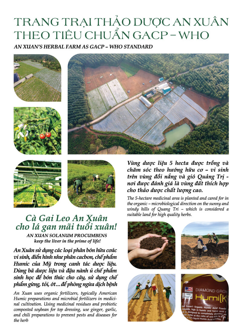Cũng là dược liệu, cũng là Cà gai leo, nhưng Cà gai leo An Xuân khác với nguyên liệu cùng loại khác chính ở cái tâm huyết, cái trăn trở, cái chăm chút trong từng công đoạn, từ khâu làm giống, làm đất, trồng cây, chăm sóc, thu hoạch, bảo quản, kiểm nghiệm, chế biến, cho đến việc hoàn thiện sản phẩm, đăng ký pháp lý cho các loại sản phẩm.